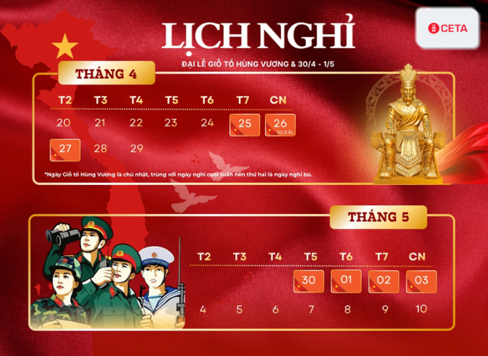 CETA THÔNG BÁO LỊCH NGHỈ LỄ GIỖ TỔ HÙNG VƯƠNG, NGÀY GIẢI PHÒNG MIỀN NAM THỐNG NHẤT ĐẤT NƯỚC 30-04 VÀ QUỐC TẾ LAO ĐỘNG 01-05